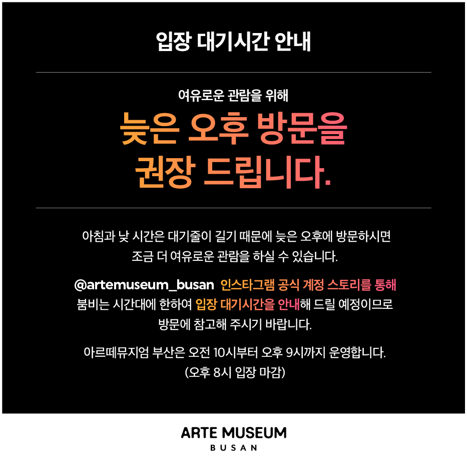 부산 아르떼뮤지엄의 입장 마감 시간은 20:00입니다. 늦게 방문할 경우 입장 마감 시간을 꼭 확인하고 방문하세요.