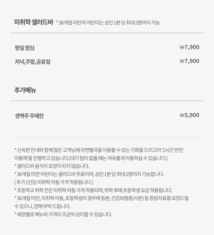 자연별곡 한식뷔페 2024년 가격