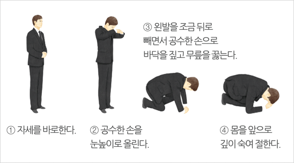 - 절: 유교식 장례에서는 절이 중요한 예절입니다. 남성은 큰절을 두 번, 여성은 공손히 절을 합니다.