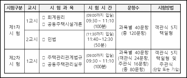주택관리사 시험은 1차와 2차로 나누어져 있으며, 각 단계는 주택관리 업무에 필요한 다양한 영역의 지식을 평가합니다.