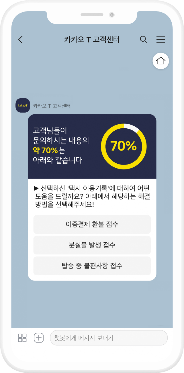 고객센터 챗팅창에서 분실물이 있다면 '택시 분실물'을 선택하고 상담원과 연결할 수 있습니다. 또한, 서비스 이용 중 발생한 문제도 상담원과 직접 해결할 수 있습니다. 문제 발생 시 빠르게 대응할 수 있어 사용자들에게 큰 도움이 됩니다.