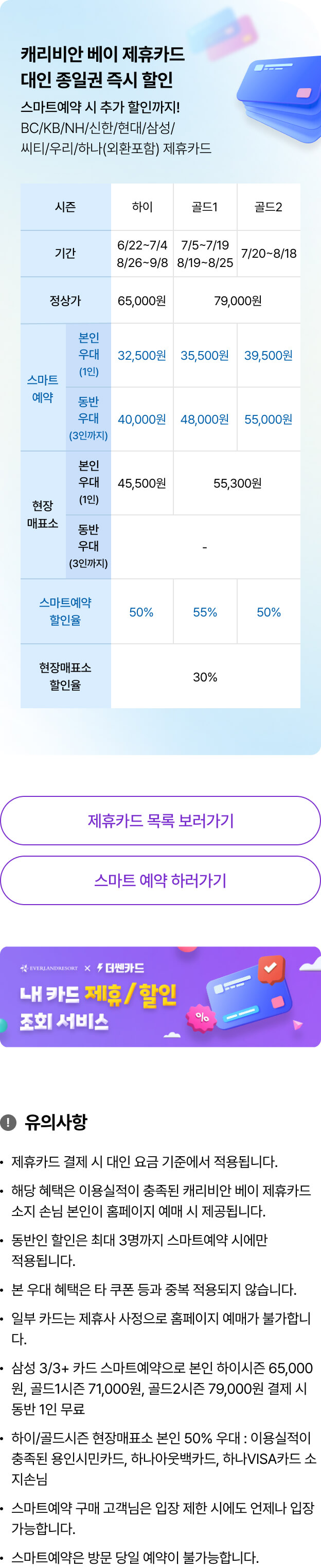 여러 신용카드사와의 제휴를 통해 할인 혜택을 받을 수 있습니다. 예를 들어, 특정 카드로 결제하면 입장료의 10%에서 30%까지 할인이 가능합니다. 제휴 카드 목록과 혜택은 캐리비안베이 공식 웹사이트에서 확인할 수 있습니다.