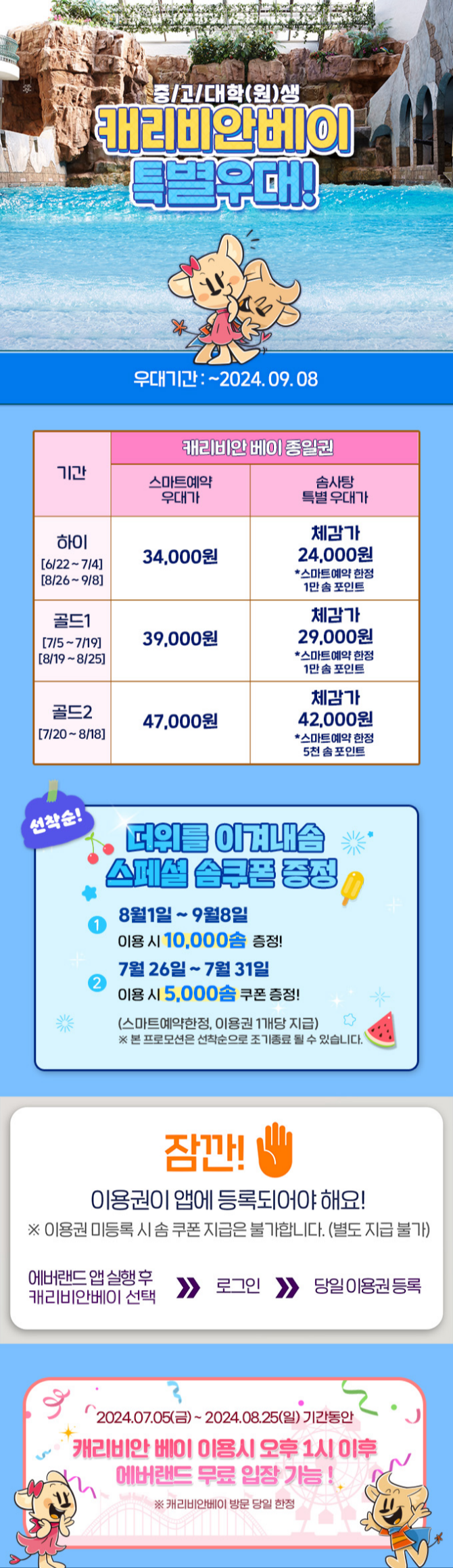 캐리비안베이 입장료를 절약할 수 있는 여러 가지 방법이 있습니다. 제휴 할인, 온라인 예매 할인, 패키지 티켓 이용, 그리고 시즌별 프로모션과 이벤트를 활용하면 많은 금액을 절약할 수 있습니다. 예를 들어, 특정 카드로 결제하면 일정 비율의 할인을 받을 수 있고, 특히 온라인 사전 예약을 이용하면 손쉽게 할인된 가격에 입장권을 구매할 수 있습니다. 또한, 에버랜드와 캐리비안베이 두 곳을 모두 이용할 수 있는 패키지 티켓을 구입하면 더 경제적입니다. 특히 8월 25일까지 캐리비안베이 입장권으로 에버랜드도 이용할 수 있는 이벤트를 놓치지 마세요. 공식 홈페이지에서 최신 이벤트를 확인하세요.