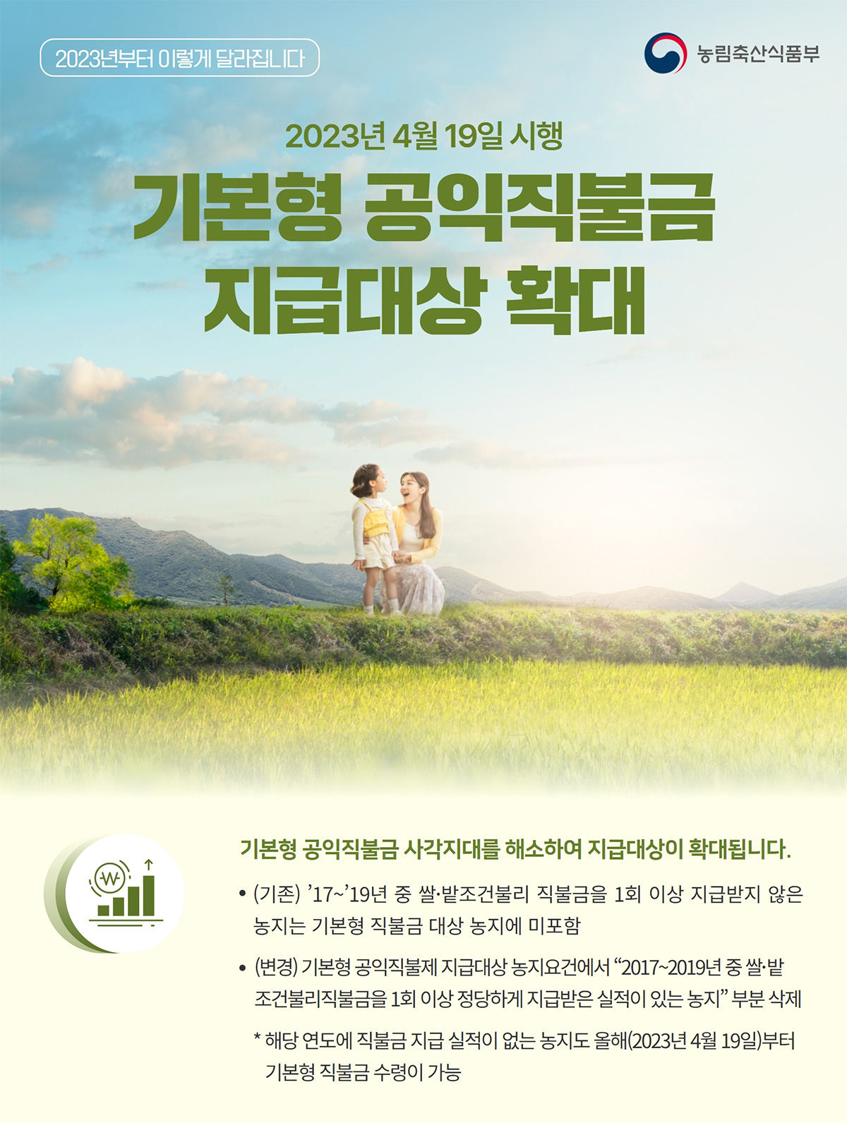 공익직불제는 농업활동을 통한 공익기능 증진을 위해 농업인에게 보조금을 지원하는 제도입니다. 이 제도는 국가의 농업정책 중 한 축으로, 농업인의 경제적 부담을 덜어주고 농업의 지속 가능성을 확보하며, 공익적인 농업 활동을 유도하고자 도입되었습니다. 2024년부터는 소농직불금 지급단가가 농가당 120만원에서 130만원으로 10만원 인상되었습니다.